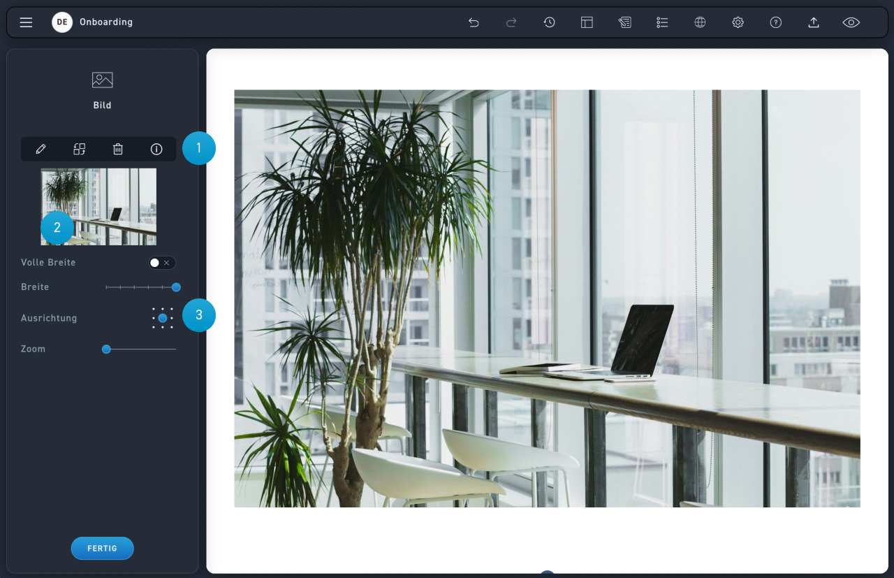 Fahre mit der Maus über die Bildfläche im Bearbeitungsfenster und klicke die gewünschte Option an, um ein Bild zu ersetzen oder zu löschen.