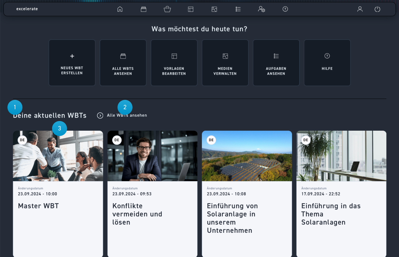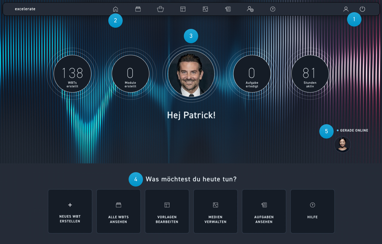 Das Dashboard ist dein Startpunkt für alle deine Aktivitäten in excelerate. Es bietet dir eine Übersicht über alle Bereiche. Du hast hier auch den direkten Zugriff auf alle Funktionen für die Erstellung und Verwaltung deiner WBTs, Medien, Vorlagen und Aufgaben. Dabei kannst du die wie gewohnt die Navigationsleiste oben oder die Aktionskacheln weiter unten verwenden. Das Dashboard zeigt dir auch interessante Statistiken zu deiner Produktivität. Und du siehst, wer außer dir im Moment in excelerate angemeldet ist.