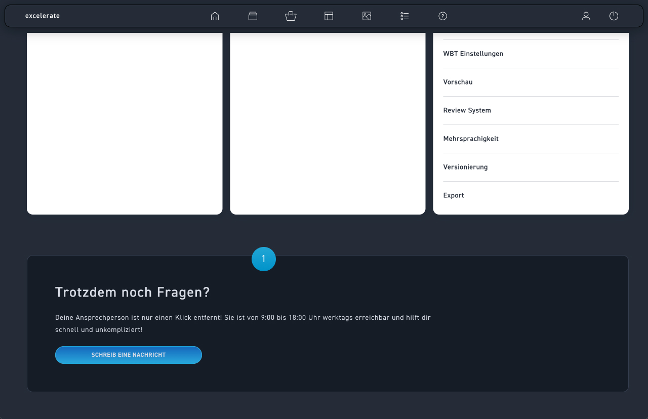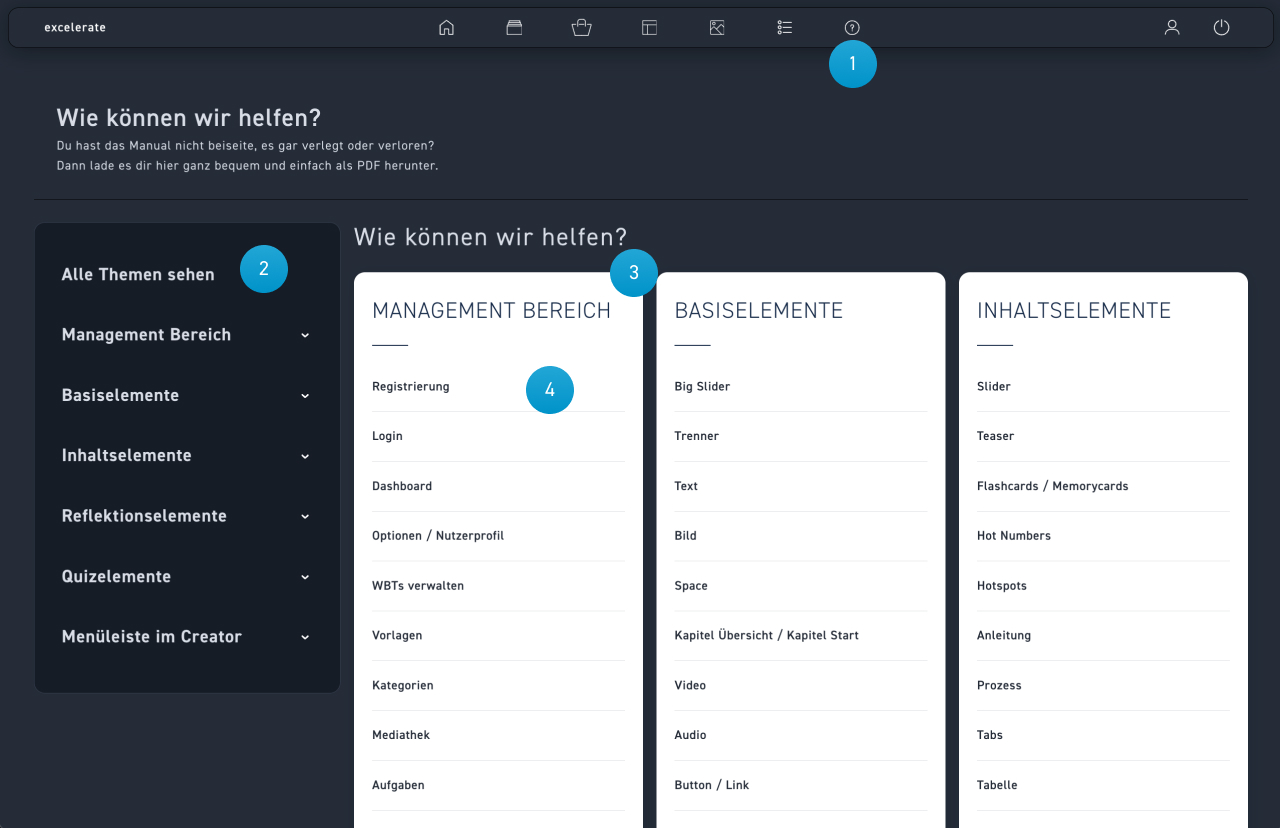 Falls du einige Schritte nochmal nachlesen möchtest, so kannst du dafür die Hilfe Seite von excelerate nutzen. Hier kannst du nach Begriffen suchen oder direkt die vorgeschlagenen Artikel nutzen.