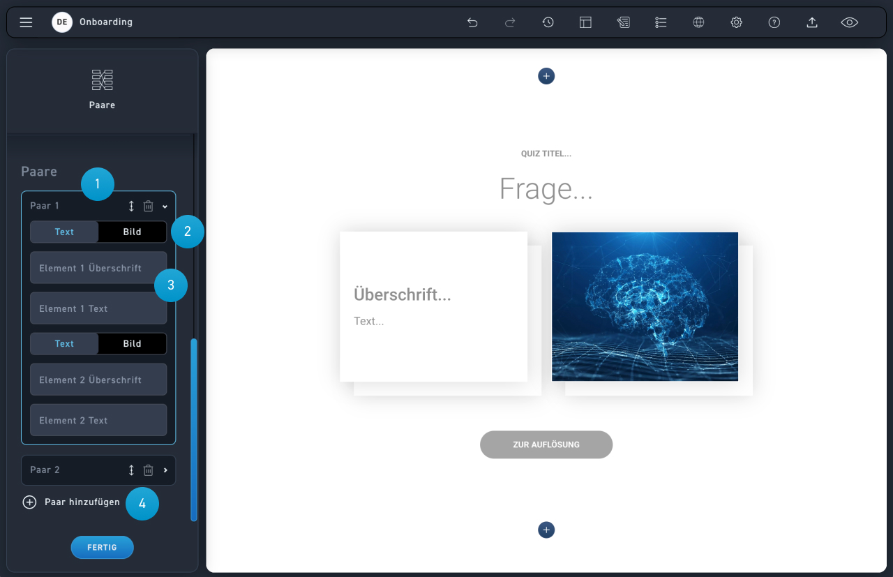 Lasse deine Nutzer die richtigen Paare finden und zuordnen. Ein Paar kann auch aus Text- als auch Bildkarten bestehen.