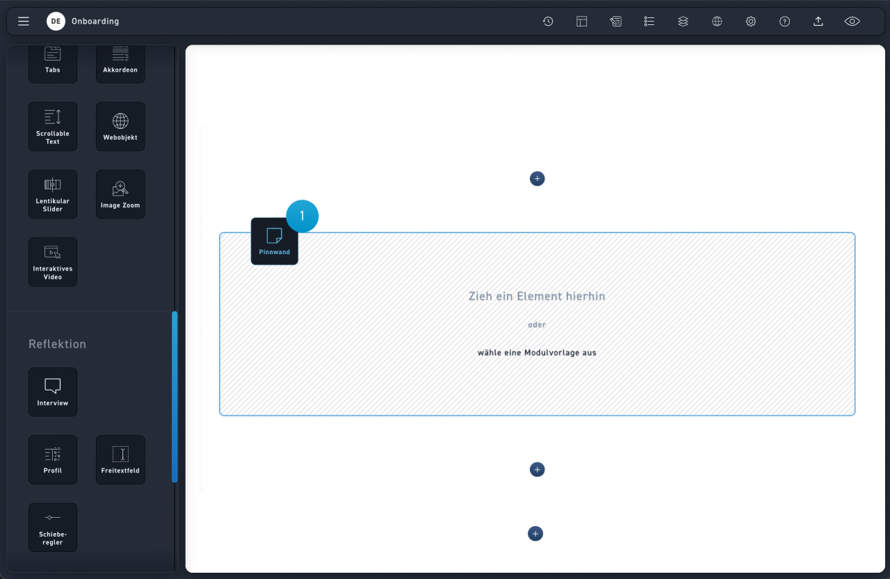 Ziehe das Element Pinnwand in das gewünschte Modul. Hier gibt es keine weiteren Einstellungen.