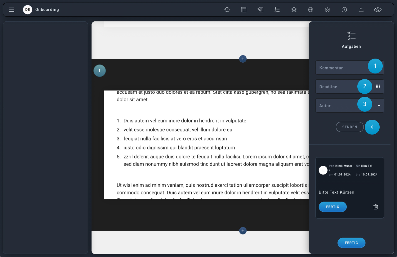 Mit dem Review System könnt ihr ganz einfach Kommentare auf jedem Element hinterlassen und sogar Dateien anhängen, eine Deadline setzen und die Aufgabe an die richtige Person vergeben. Klicke auf das Listen Symbol, um in den Aufgaben Modus zu wechseln.