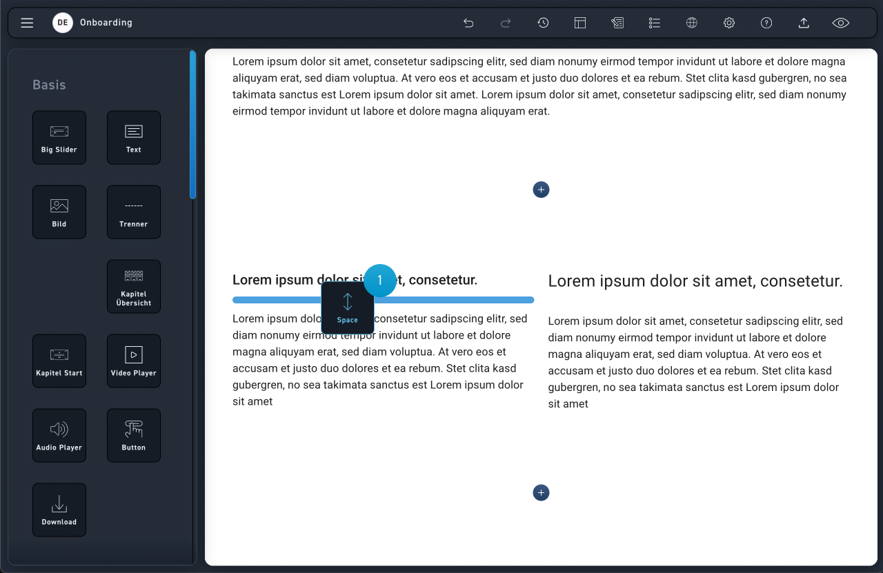 Mit dem Space Element kann der (horizontale) Abstand zwischen zwei Elementen verändert werden. Trage einen Wert kleiner als 30px ein, um den Abstand zu verringern und einen Wert größer als 30px, um ihn zu vergrößern.