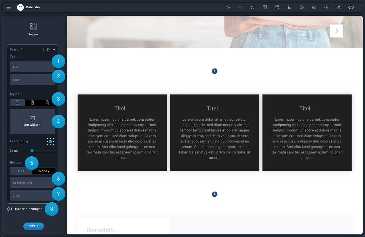 Wähle Teaser, wenn du deinem Lerner mehrere gleichrangige Themen oder Gegenstände im Überblick präsentieren möchtest. Zum Beispiel für Content-Kategorien, Produkte, Sachen, Aspekte, Eigenschaften oder Aktionen.